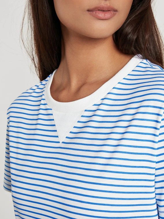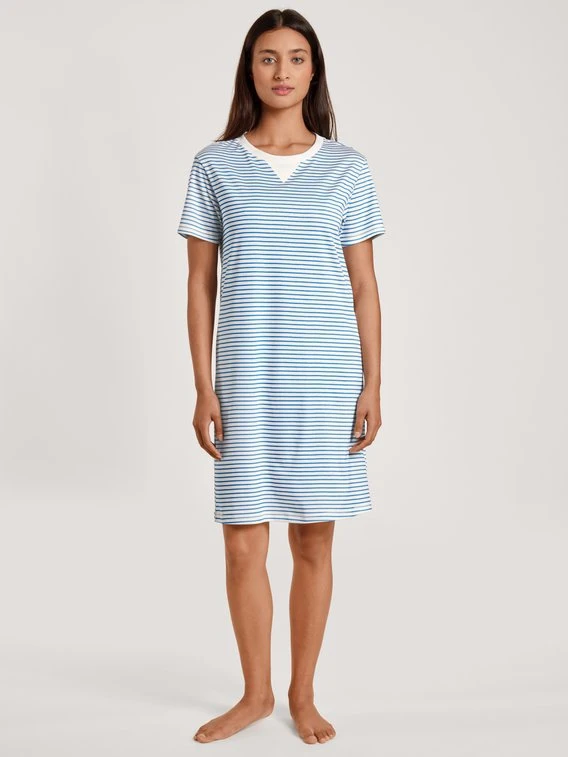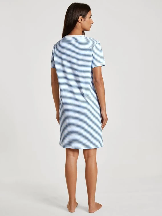 Schlicht und doch so trendy: Das DAYLIGHT DREAMS Nightshirt von CALIDA holt den maritimen Streifen-Look von der Boje in die Koje. Als gerade geschnittenes T-Shirt-Kleid mit Design-Detail am Rundhalskragen begleitet es mühelos jeden Relax-Einsatz. Die pflegeleichte Baumwolle ist langlebig verarbeitet und lässt die Haut beim Träumen und Entspannen atmen.