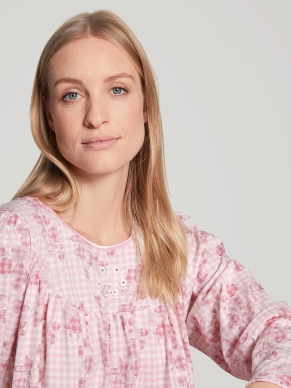 Feminines, klassisches Langarmnachthemd im Raglanschnitt aus kuscheligem, weich fließendem Baumwoll-Interlock. Die bequeme Weite zum Schlafen wird durch den hübsch gereihten Ansatz an der oberen Passe erreicht. In der Mitte der Passe ist eine bezaubernde Blüte gestickt. Den Halsausschnitt ziert ein fein schimmerndes Satinbändchen.