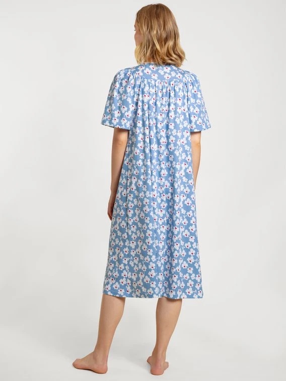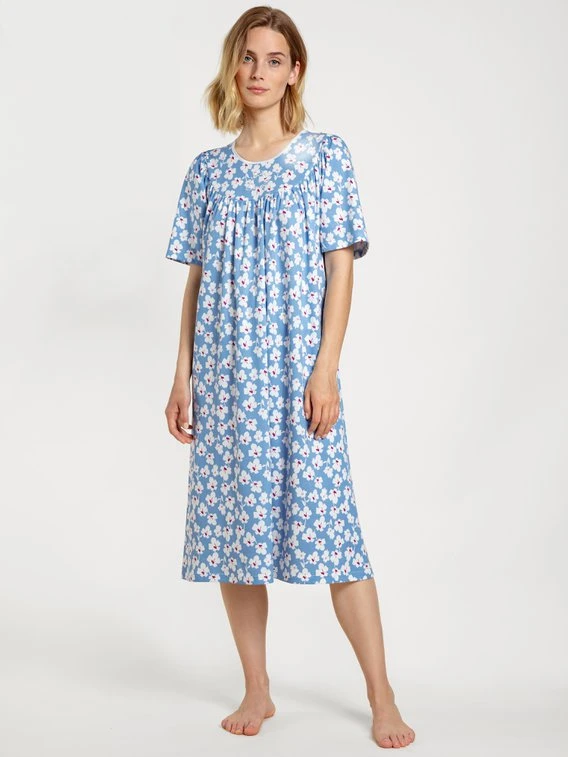 Feminines, klassisches Kurzarmnachthemd im Raglanschnitt aus kuscheligem Baumwoll-Interlock. Die bequeme Weite zum Schlafen wird durch den hübsch gereihten Ansatz an der oberen Passe erreicht. Den Halsausschnitt ziert ein feines, schimmerndes Satinbändchen. In der Mitte der Passe ist eine Blüte gestickt.
