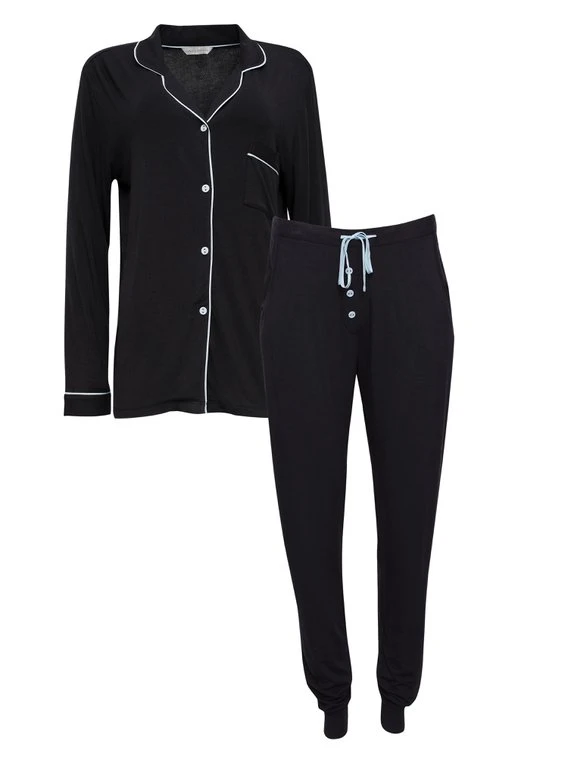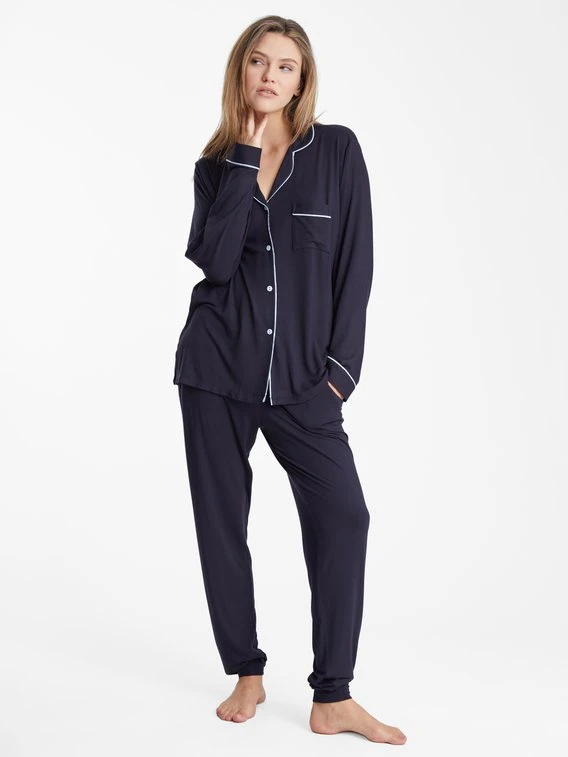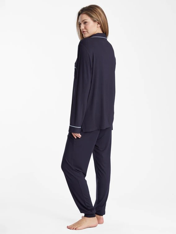 Der Pyjama aus der “Beth” Serie von CYBERJAMMIES begeistert durch einen Mix aus Baumwolle und Modal. Das Material liegt angenehm weich und kühlend auf der Haut und sorgt für hochwertigen Tragekomfort. Klassische Design-Elemente akzentuieren den coolen Look gekonnt.