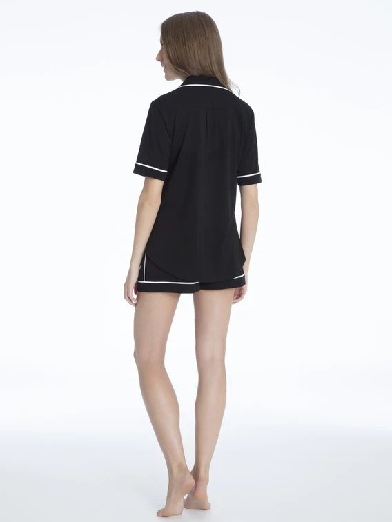 Der kurze Pyjama von DKNY aus der Serie “New Signature” steht für ein angenehmes Tragegefühl. Die leichte Single Jersey-Qualität aus Baumwolle und Viskose legt sich sanft an Deinen Körper und lädt somit zum Relaxen und Entspannen ein. Der klassische Schnitt wird durch kontrastfarbene Nähte aufgelockert. Das Hemdoberteil verfügt über eine kleine Brusttasche und ist am Saum abgerundet. Die kurze Hose kann mit einem Kordelzug praktisch geschnürt werden.