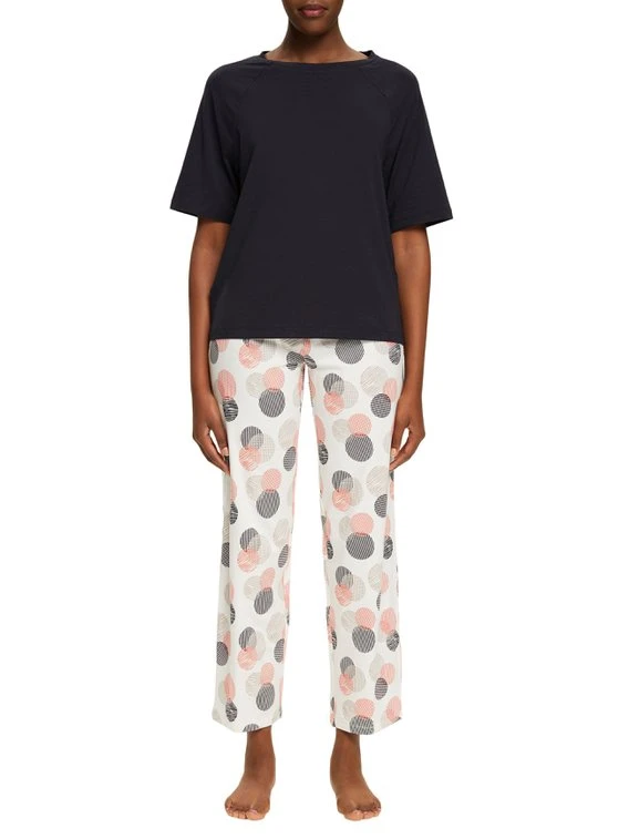 Pyjama mit Kurzarm-Shirt von ESPRIT aus der Kollektion “Seasonal Print”. Das Schlaf-Set eignet sich aufgrund seiner Zusammenstellung aus 7/8-Pants und Halbarm-Shirt ideal für den Übergang. Die lockere Passform sorgt für genug Bewegungsfreiheit in der Nacht.