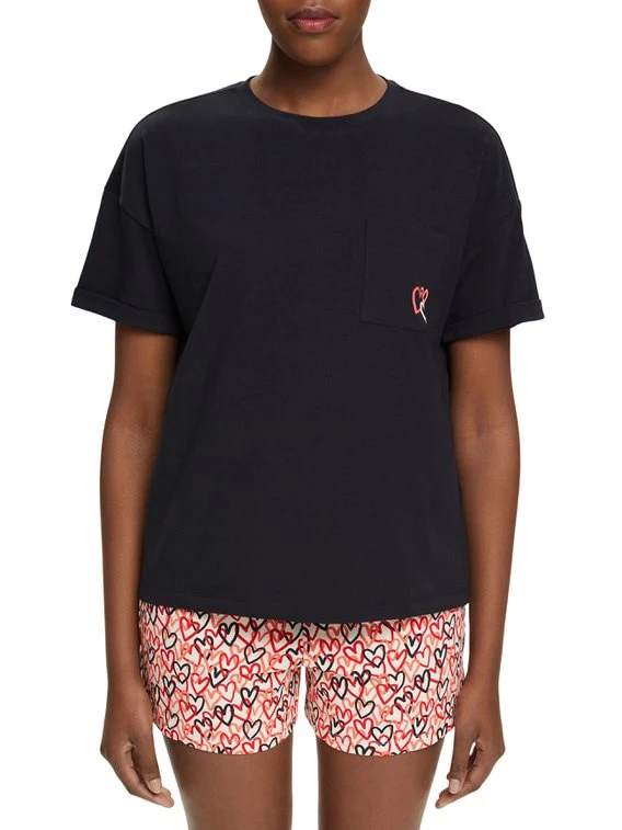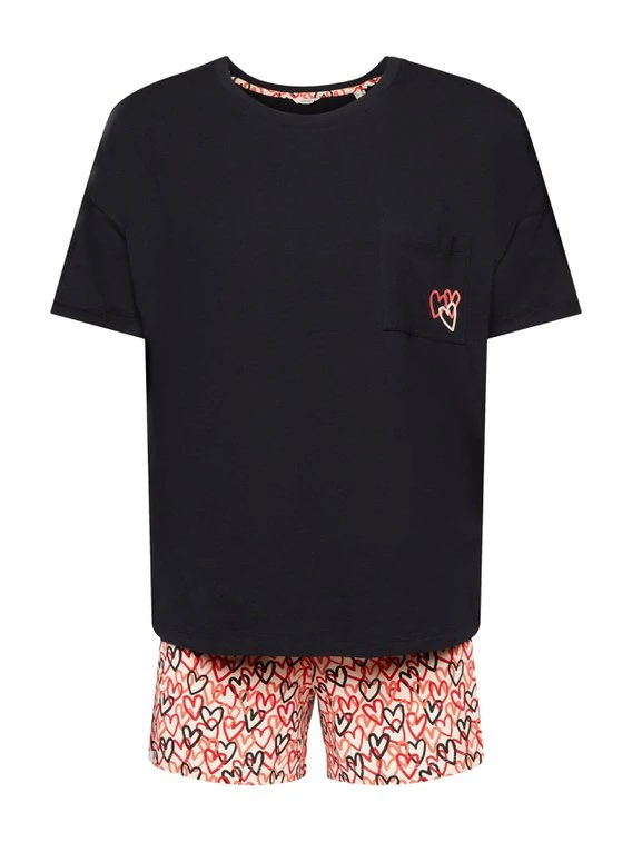 Der Kurz-Pyjama von ESPRIT aus der “Valentine” Kollektion überzeugt mit einem weichen, elastischen Baumwoll-Mix, um höchsten Tragekomfort für erholsame Stunden zu bieten. Das Set besteht aus einer Shorts mit niedlichem Herzprint und passendem T-Shirt mit einer aufgesetzten Brusttasche. Das besondere Design macht die Sleepwear zu einem echten Allround-Geschenk für die Liebsten oder einfach für sich selbst.