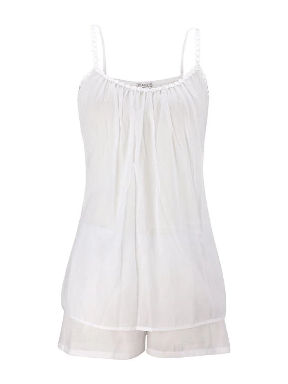 Herrlich leichter Kurz-Pyjama in weiter. leichter Schnittform. Gefertigt aus feinstem, leicht transparentem Baumwoll-Mousseline mit kostbarer Perlenstickerei am Rundhalsausschnitt und den schmalen Trägern. Am Ausschnitt ist das romantische Nachtkleid in schöne Fältchen gelegt und umfließt somit schmeichelnd Ihren Körper. Nachtwäsche-Design aus dem Hause EVA BITZER.