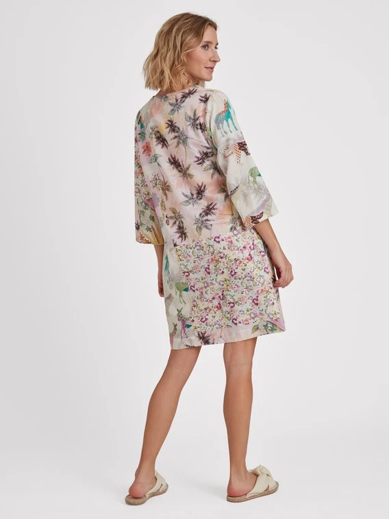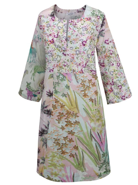 Sommerlich leicht liegt das Kleid von EVA BITZER aus der Serie “Piu Bella Cosa” auf der Haut. Durch die glatte Satinbindung fließt das Material locker an der Silhouette entlang. Die klassische Tunika mit relaxter Passform, 3/4-Ärmel und einem Rundhalsausschnitt mit tiefen Schlitz ist der ideale Begleiter am Strand oder für einen Stadtbummel. Das Palmen-Muster ergänzt das sommerliche Feeling perfekt.
