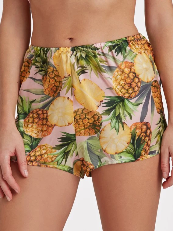 Süße Träume beschert dieses Pyjama-Set von EVA BITZER aus der Serie “Solane Street”. Das Top aus einem weichen Seide-Baumwoll-Mix besticht mit seiner zarten Spitze an Ausschnitt und Ärmelabschlüssen. Die kurze Pants überzeugt mit lockerem Schnitt, tropischem Print und feinem Material aus 100% Seide. Dank diesem tollen Material-Mix steht dem erholsamen Schlaf nichts mehr entgegen!