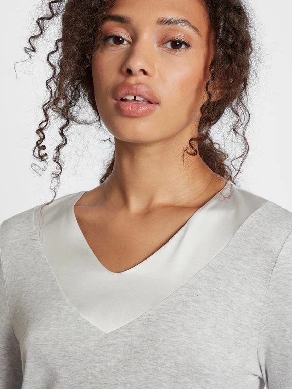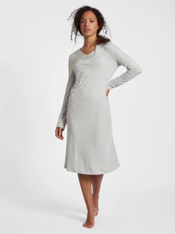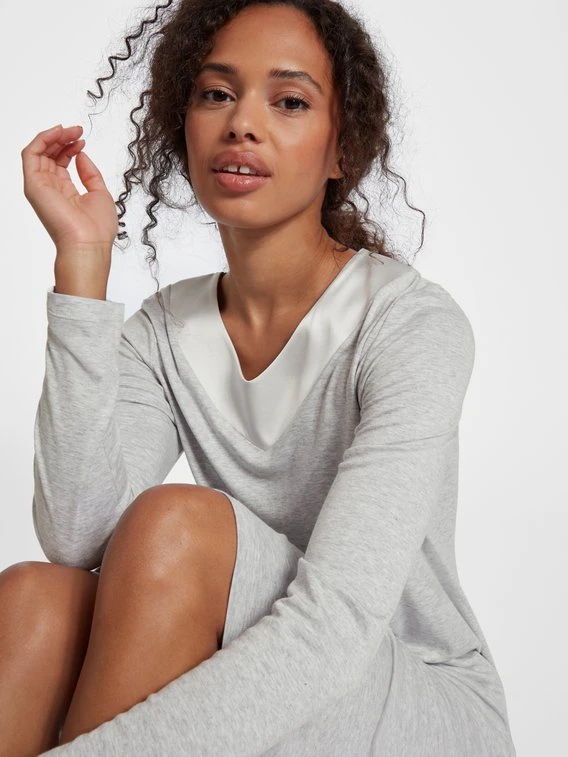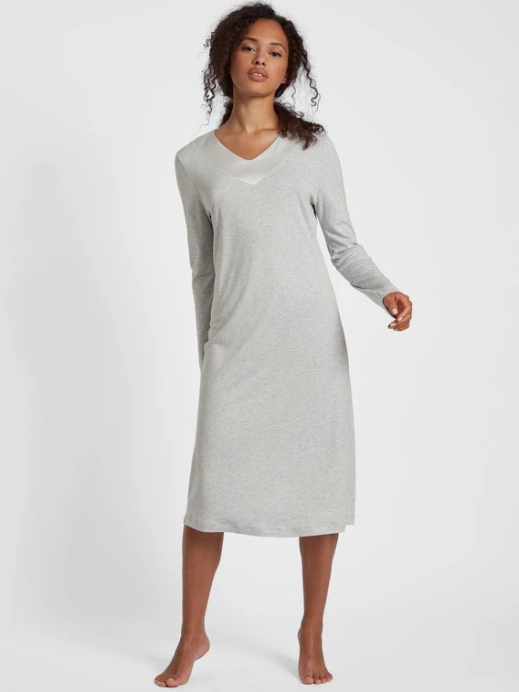Gemütliches Nachtkleid mit langen Ärmeln aus der Serie “Mira” von HANRO. Das puristische Design wird durch eine besondere Kragenlösung mit hochwertiger, elastischer Satinseide ergänzt. Weiche Baumwoll-Modal-Mischung schmiegt sich sanft an die Haut an und bietet höchsten Tragekomfort.