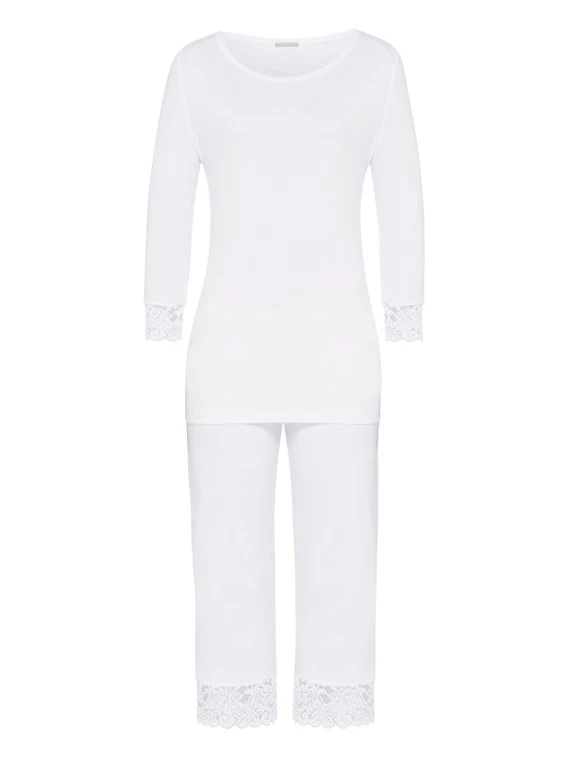 Der Crop Pyjama der Serie „Moments“ von HANRO steht für feminine Spitzennachtwäsche und hohen Komfort. Das Set besteht aus einem etwas länger geschnittenen Oberteil mit ¾-Ärmeln und einer die Figur umspielenden Caprihose. Das weiche, strapazierfähige Gewebe aus merzerisierter Baumwolle überzeugt mit einem angenehmen Griff und bestem Tragekomfort. Das Highlight des Pyjamas sind die femininen, floralen Spitzenabschlüsse an Ärmeln und Bein.