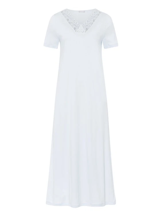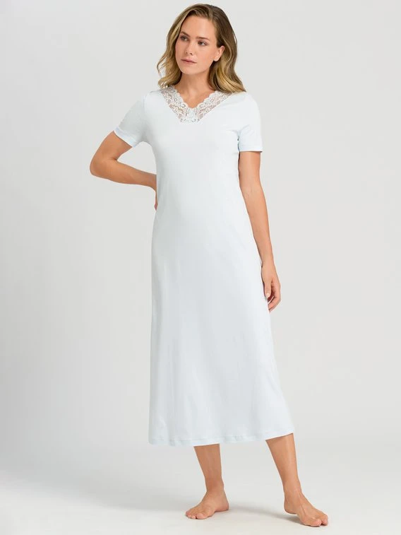 Langes Nachtkleid mit Spitze aus der Serie „Moments Nightwear“ von HANRO. Weiche Interlock-Qualität aus 100% merzerisierter Baumwolle sorgt für ein angenehm weiches Tragegefühl. Der florale Spitzeneinsatz am Ausschnitt verleiht dem sanft fallendem Nachtkleid einen femininen Ausdruck.