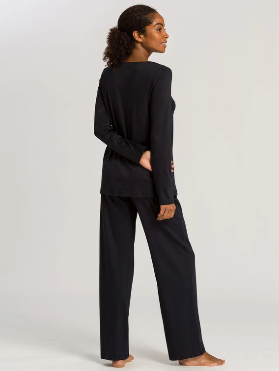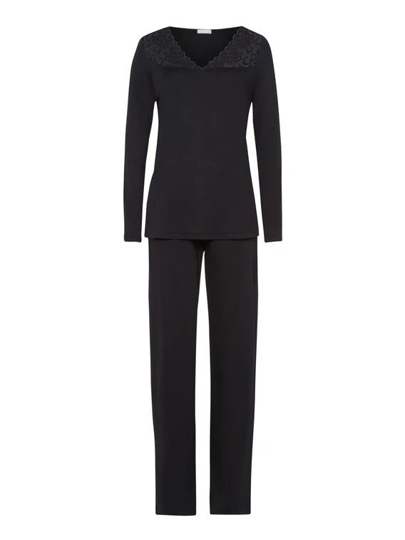 Komfortabler Pyjama mit Spitze aus der Serie “Moments” von HANRO. Softe Interlock-Qualität aus 100% merzerisierter Baumwolle sorgt für ein natürlich weiches Gefühl auf der Haut. Die Spitze am Dekolleté mit einem Hauch Transparenz bezaubert mit femininer Eleganz.