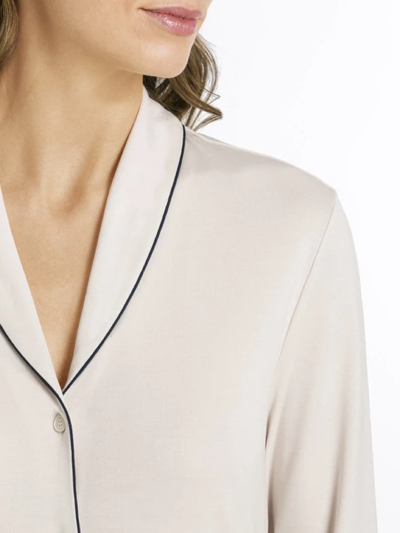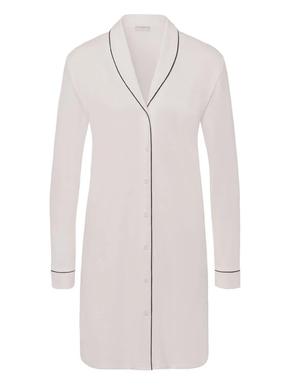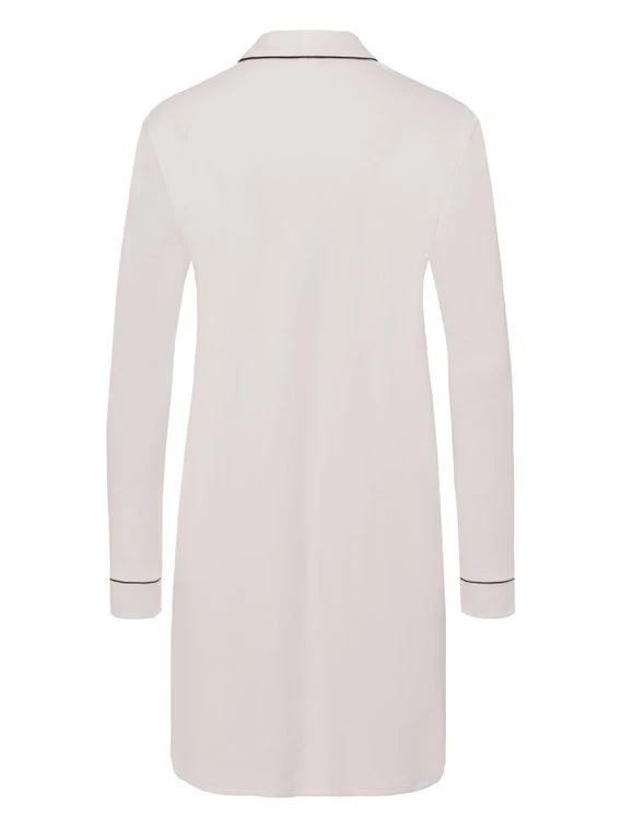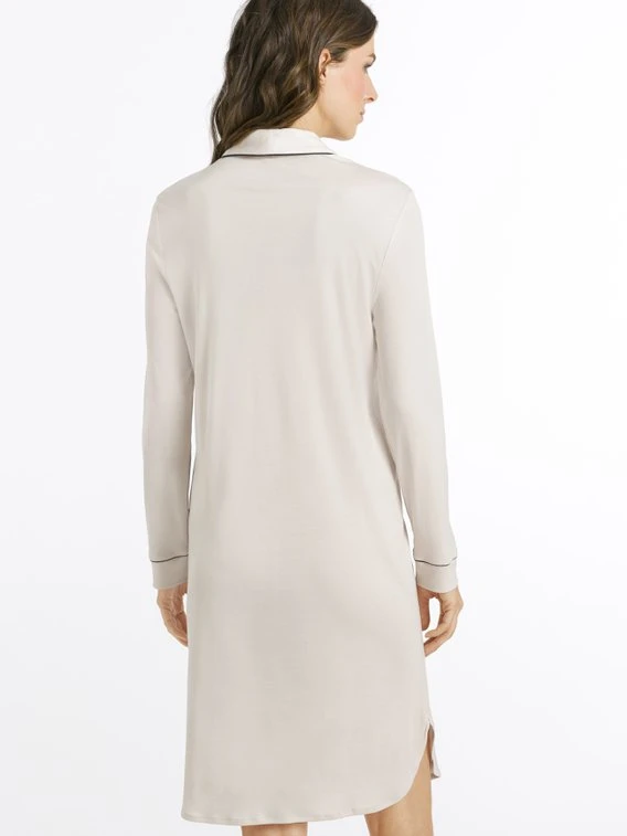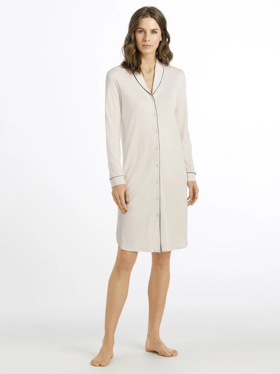 Zeitloses Nachtkleid mit Knopfleiste aus der neuen „Natural Comfort“ Kollektion von HANRO. Schön ist der seitlich geschlitzte Saum, der lässige Hemdkragen und die dezenten Paspelierungen. Die Länge von 100cm garantiert beim Schlafen ausreichend Beinfreiheit.