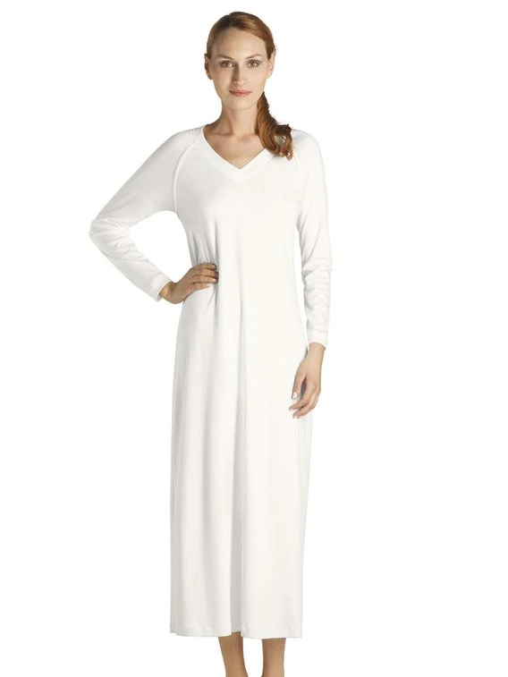 Feminines Langarm-Nachthemd mit langer Schnittform aus der Serie “Pure Essence” von HANRO. Die Interlock-Qualität aus 100% merzerisierter Baumwolle, ist sehr hochwertig und natürlich weich auf der Haut. Die Schnittform mit Raglanärmeln und ein weiter V-Ausschnitt geben einen trendigen Look.