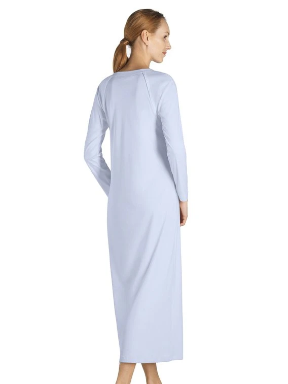 Feminines Langarm-Nachthemd mit langer Schnittform aus der Serie “Pure Essence” von HANRO. Die Interlock-Qualität aus 100% merzerisierter Baumwolle, ist sehr hochwertig und natürlich weich auf der Haut. Die Schnittform mit Raglanärmeln und ein weiter V-Ausschnitt geben einen trendigen Look.