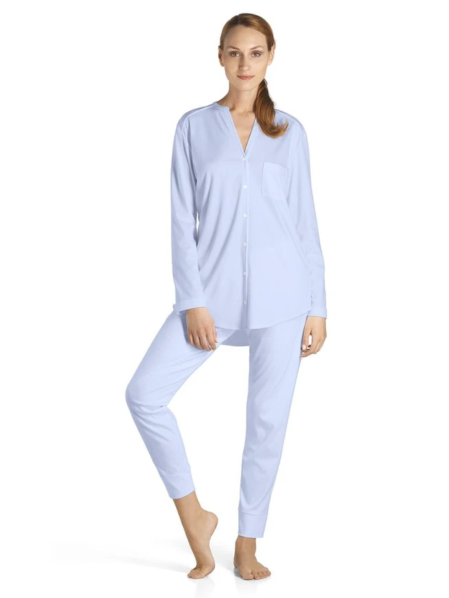 Puristischer Pyjama mit durchgeknöpftem Oberteil aus der Serie “Pure Essence” von HANRO. Die Interlock-Qualität aus 100% merzerisierter Baumwolle, ist sehr hochwertig und natürlich weich auf der Haut. Die Schnittform mit durchgeknöpftem Shirt, aufgesetzter Brusttasche und aufgeschlagenen Ärmelabschlüssen gibt den trendigen Boyfriend-Look.