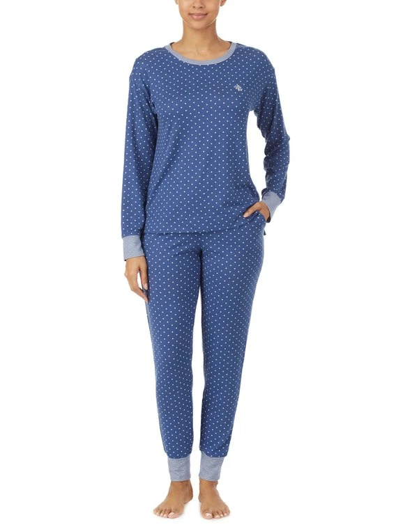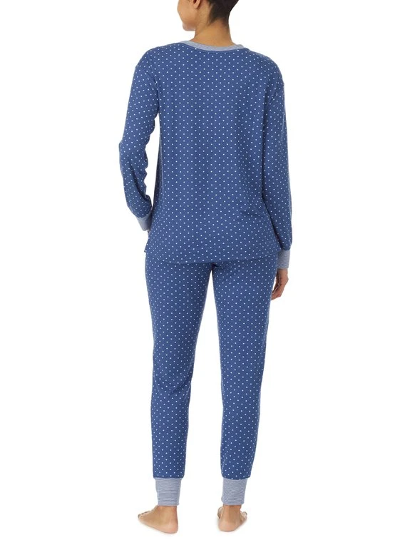 Wenn ein Lounge-Set nicht nur super gemütlich, sondern auch noch schick aussieht, dann sprechen wir vom Jogger-Set der Marke LAUREN BY RALPH LAUREN. Sowohl Oberteil als auch Hose bestehen aus angenehmen Jersey-Material. Das Langarmshirt mit breitem Rundhalsausschnitt ist wie die gerade geschnittene Hose mit einem Allover-Punkte Muster designt. Die geringelten Abschlüsse an Ärmeln und Beinen verleihen diesem Look das gewisse Etwas. Sportlich und verspielt zugleich kann man sich hier jederzeit vollends wohlfühlen.