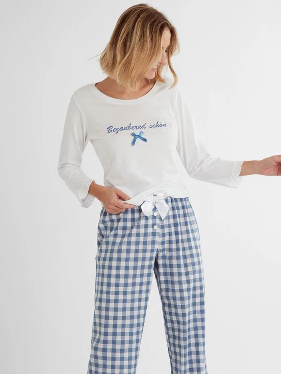 Der Pyjama aus der Serie “Bezaubernd schön” von LOUIS & LOUISA ist der perfekte Basic Pyjama für den Alltag. Der Look wird durch Satinschleifchen am Shirt und den Pants im Karomuster perfekt ergänzt. 100% Baumwolle liegt angenehm weich und leicht auf der Haut und verzaubert mit tollem Tragegefühl.