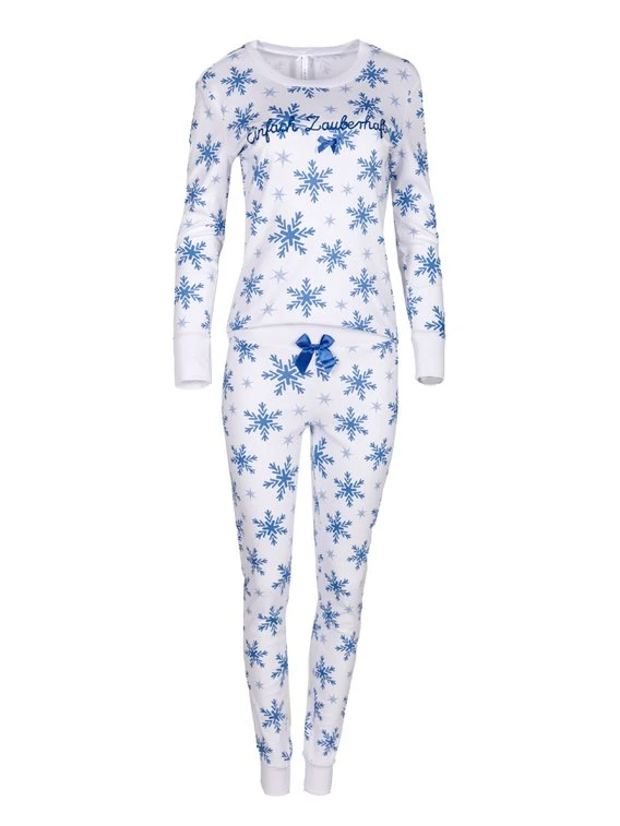 Der kuschelweiche Bündchen-Pyjama aus der “Einfach Zauberhaft” Serie von LOUIS & LOUISA, sticht durch sein Schneeflockenallover hervor. Süße Details auf dem Langarmshirt, wie das Schleifchen und das gestickte “Einfach Zauberhaft” machen den Look perfekt. Der Stoff aus 100% Baumwolle und die weichen Bündchen sind besonders angenehm zu tragen und sorgen für erholsame Nächte.