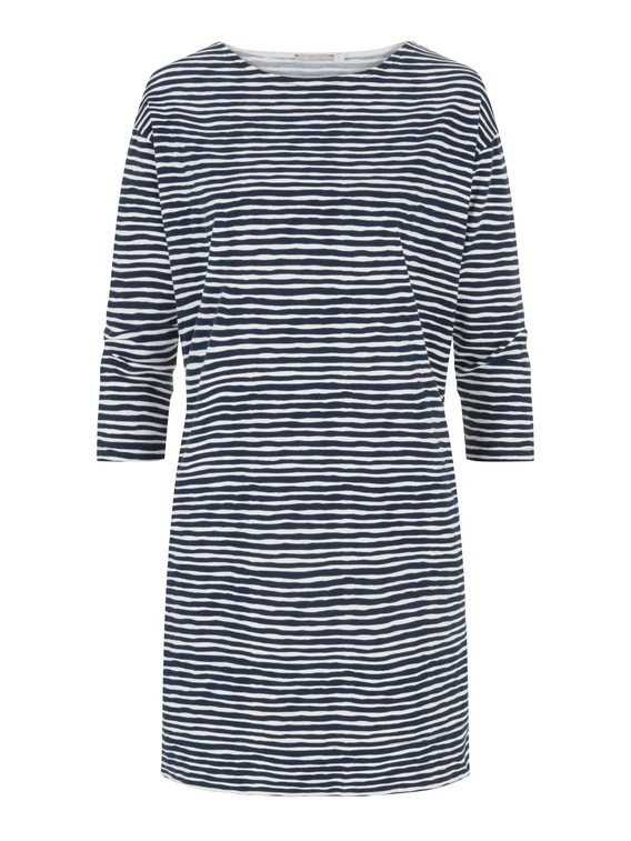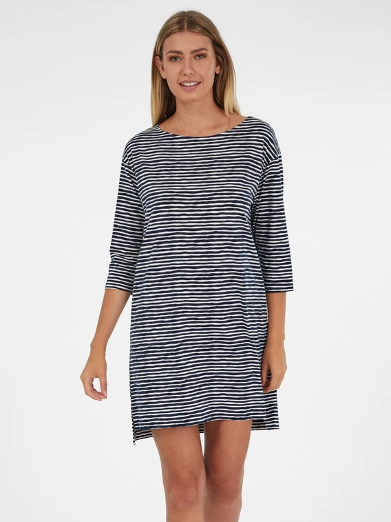 MEY präsentiert mit der Serie „Abbi“ aus der sportiven Night2Day-Kollektion eine neue Basic-Reihe, die mit einem maritimen Ringel-Design und hochwertigen, hautfreundlichen Materialien punktet. Das Bigshirt der Serie macht sowohl als Nachthemd als auch als bequemes Lounge- und Freizeitkleid eine gute Figur. Das Kleid mit ¾-Ärmel besteht aus einem elastischen Materialmix aus Baumwolle und Modal, der ein angenehm natürliches Tragegefühl vermittelt. Der gerade, figurumspielende Schnitt und der Saum mit Seitenschlitzen ermöglicht zudem einen bequemen Sitz und maximale Bewegungsfreiheit.