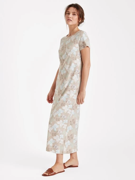 Erlebe mit dem “Amelie”-Kleid von NANSO ein modisches Highlight für deine Garderobe. Dieses kurzärmlige Nachthemd ist aus einem leichten Baumwoll-Modal-Mix und einer weichen Single Jersey-Qualität gefertigt, was es zu einem langlebigen und hochwertigen Produkt macht. Der Allover-Print verleiht dem Kleid eine einzigartige und kreative Note. Dank Seitenschlitzen hast du beim Tragen viel Bewegungsfreiheit und der Rundhalsausschnitt verleiht dem Kleid ein modernes Finish. Mit einer Länge von 130 cm kannst du das Kleid ganz nach deinen Wünschen kombinieren, sei es mit Sneakers oder Schlappen – für den Alltag oder ein entspanntes Wochenende.