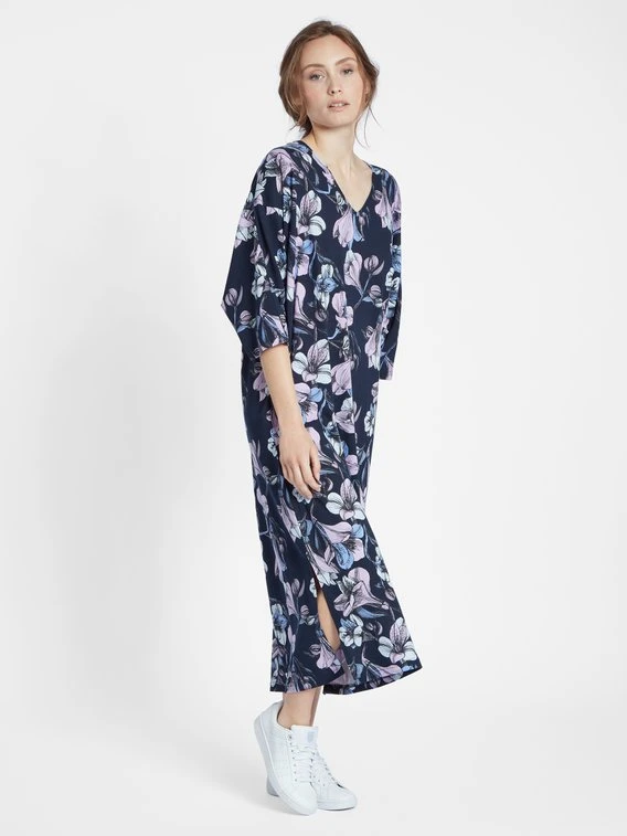 Der Kaften von NANSO aus der Serie “Kellotarha” überzeugt mit einem geblümten Design und durch absoluten Tragekomfort. Die hochwertige Materialzusammensetzung aus Modal und Baumwolle in Single Jersey Qualität liegt besonders weich auf der Haut. Mit der Länge von 120cm und den 3/4-Ärmeln ist das Kleid ein perfekter Begleiter für erholsame Stunden.