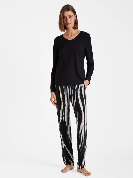 Schickes Lounge-Set von NINA VON C. aus der “Loungewear Balance” Serie. Eine gerade geschnittene Pants ergänzt ein Langarmshirt mit V-Ausschnitt zu einem Set zum Wohlfühlen. Ein auffälliger Allover-Print macht die lässige Hose zu einem stylischen Alltagsbegleiter, der vielseitig kombiniert werden kann. Seidig fließender Modal-Elasthan-Mix vermittelt ein angenehm natürliches Tragegefühl. Dank diesem tollen Komfortgefühl steht dem Relaxen nichts mehr im Wege.