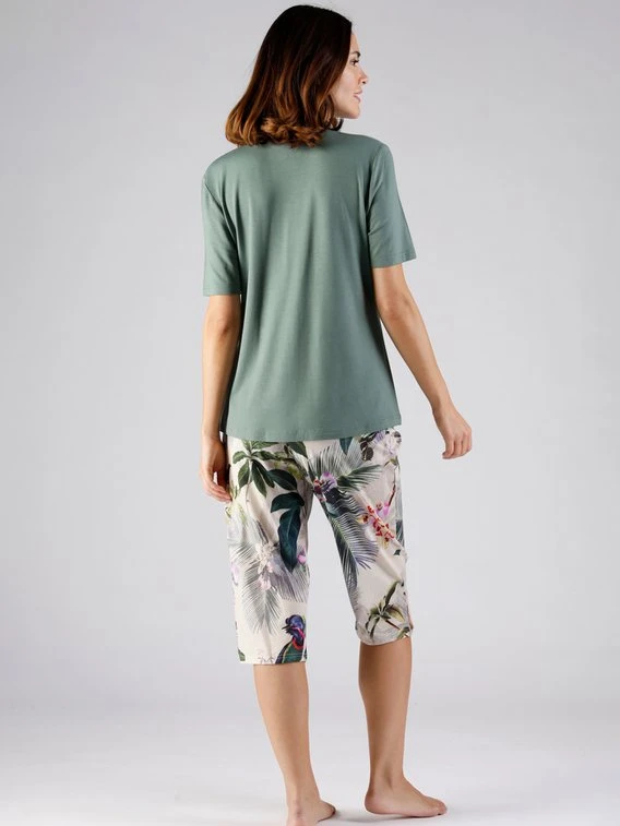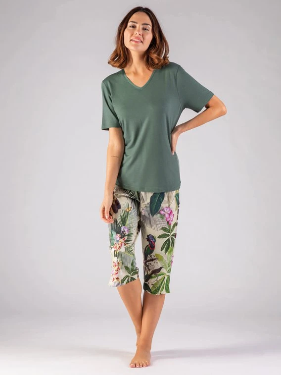 NINA VON C. präsentiert in der “Loungewear Fresh”-Kollektion einen modischen Pyjama. Das leichte Material aus einer Modalmischung eignet sich ideal für warme Sommernächte. Das unifarbene Oberteil mit V-Ausschnitt ist locker geschnitten und passt farblich ideal zur Hose. Die Hose ist mit dem tropischen Print rundherum das Highlight des Sets.