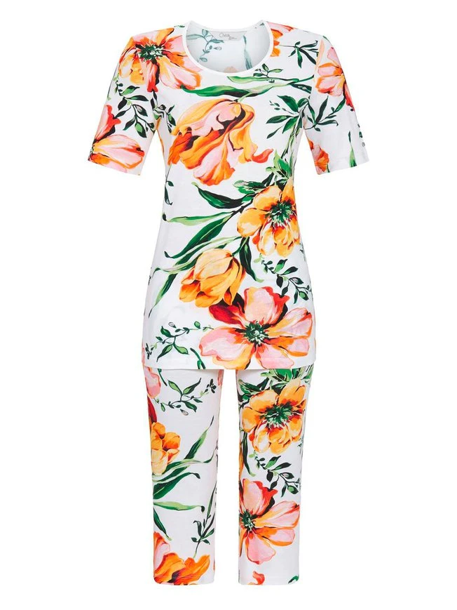 Die “Chérie Line”-Kollektion von RINGELLA setzt bei diesem Pyjama auf ein großflächiges Blüten-Design. Der Zweiteiler im frischen Look setzt zudem auf eine tolle Materialzusammensetzung aus Baumwolle und Modal für ein zartes Hautgefühl. Ein tailliertes T-Shirt mit eingefasstem Rundhalsausschnitt ergänzt eine eng anliegende Capri-Pants. Das Set ist dank seines kurzen Schnitts und dem hautfreundlichen Material der ideale Begleiter für den Sommer. Ein Schlafanzug für alle Blumen-Fans.