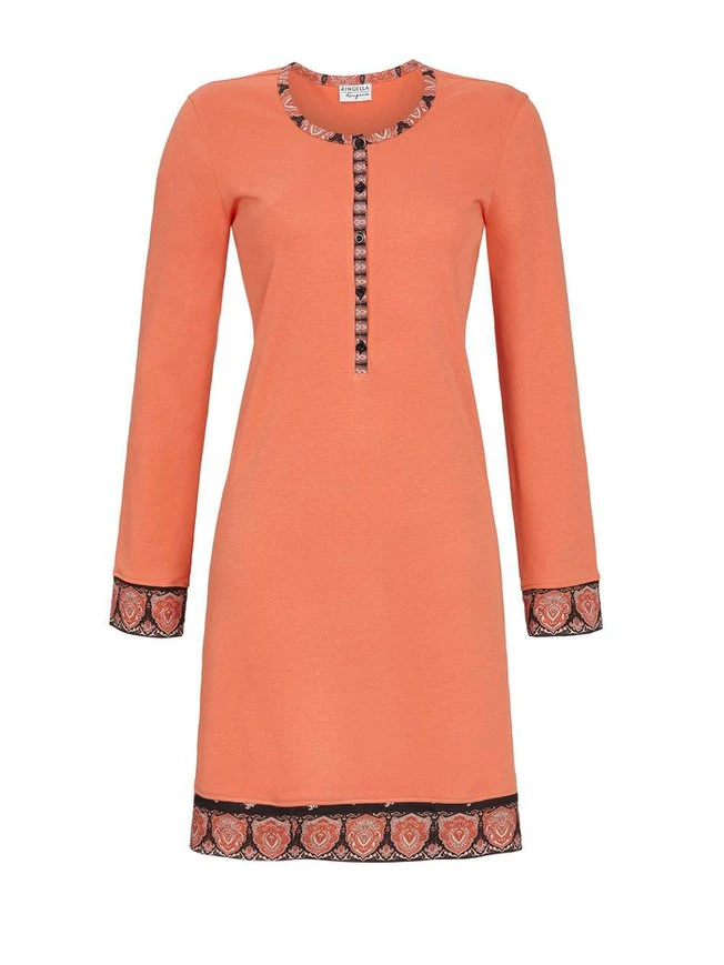 Das Nachthemd von RINGELLA aus der “Lingerie” Kollektion liegt voll im Trend. Sehr hübsch ist der Bordürendruck am Ärmel, Saumabschluss und an den Einfassungen am Hals und der Knopfleiste. Der Materialmix aus Baumwolle und Modal ist atmungsaktiv und von dauerhafter Farbbrillanz.