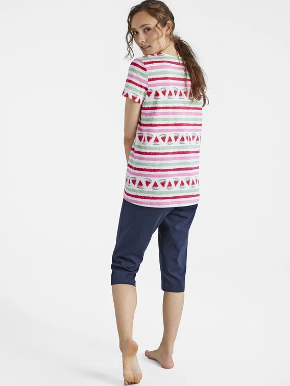 RINGELLA greift bei diesem Capri-Pyjama aus der Serie “Women” das Motiv der Wassermelone auf. Ein rot-grün gestreiftes Oberteil wird durch Wassermelonen-Prints ergänzt. Die schlichte, unifarbene Caprihose lenkt den Fokus noch mehr auf das außergewöhnliche Melonen-Muster. Der Pyjama aus reiner Baumwolle verspricht besten Tragekomfort beim Loungen und in der Nacht.