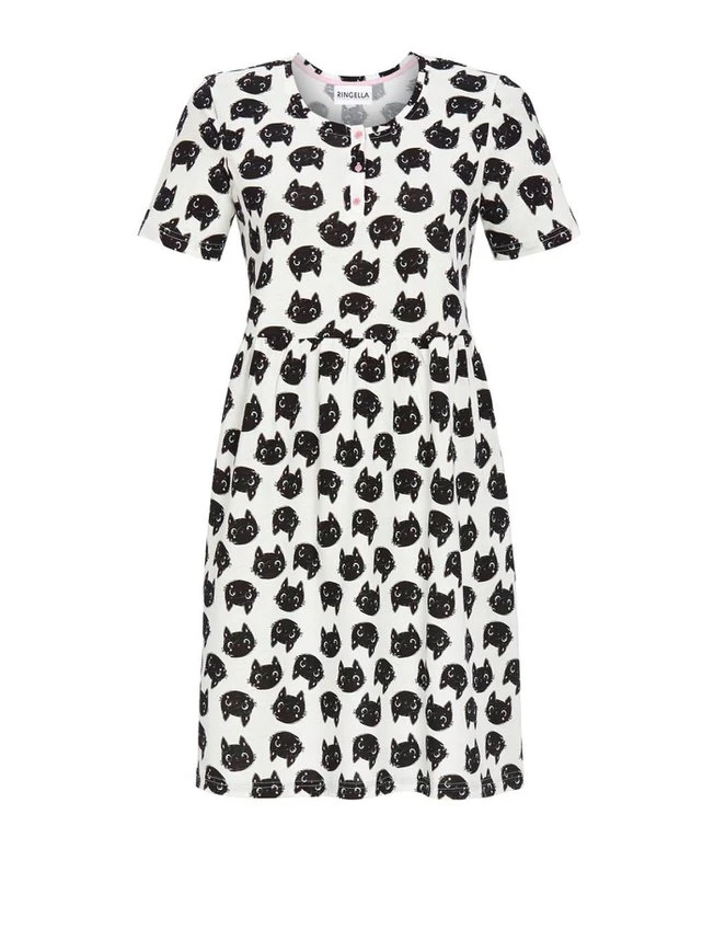 Das niedliche RINGELLA Kurzarm-Nachthemd aus der “Women”-Serie begeistert nicht nur alle Katzenfreunde! Die frechen, süßen Blicke finden auf der tollen Baumwoll-Qualität in unterschiedlichen Positionen platz. Eine kleine Knopfleiste mit farblich abgesetzten Knöpfen zieren den Ausschnitt. Die leichte Raffung im Taillienbereich rundet den femininen Schnitt ab.