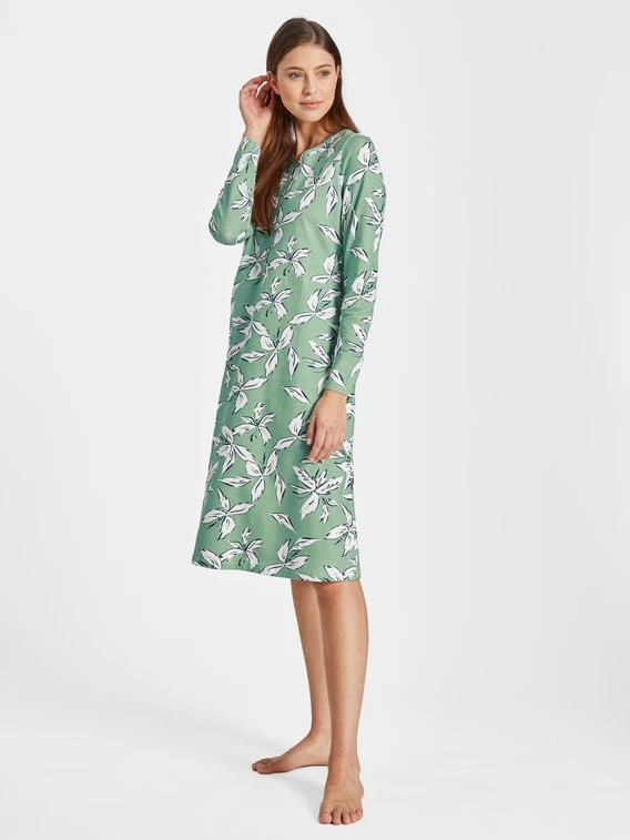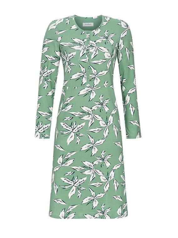 Mit einem modischen, floralen Allover-Print beeindruckt das Langarm-Nachthemd von RINGELLA aus der Serie „Women“. Das Langarm-Nachthemd besteht aus einem natürlichen Baumwoll-Modal-Mix, das mit einer hervorragenden Atmungsaktivität und einem seidigen Glanz überzeugt. Der figurumspielende Schnitt mit Taillennaht und langer Knopfleiste am Ausschnitt sorgt zudem für einen idealen, bewegungsfreundlichen Sitz des Nachthemds.