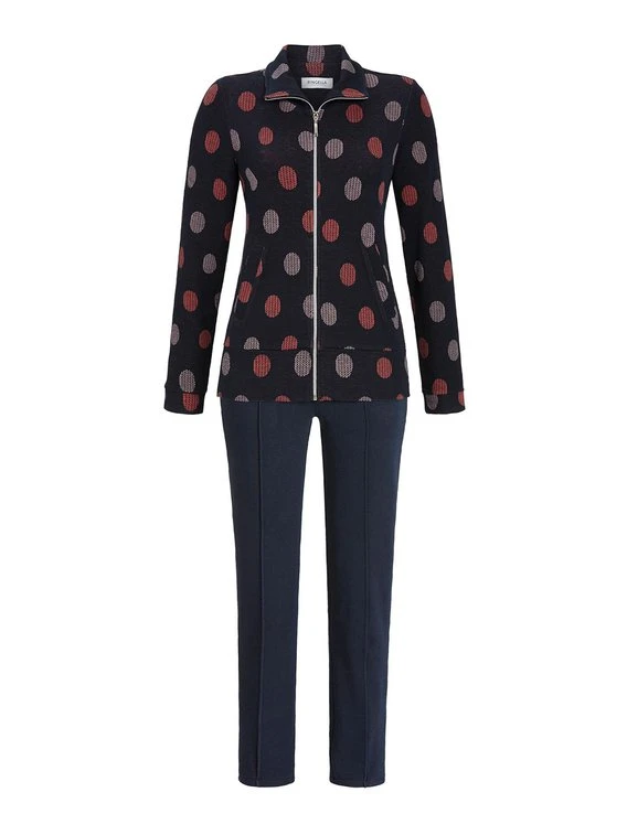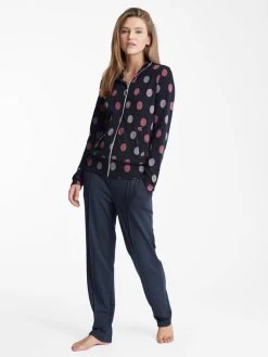 Der Hausanzug von RINGELLA besteht aus einem weichen Material-Mix in schön strukturierter Jacquard-Qualität, welcher ein leichtes und bequemes Tragegefühl fördert. Sowohl die Jacke als auch die schmal geschnittene Hose verfügen über praktische Seitentaschen. Die feine Naht auf der Vorderseite der unifarbenen Hose rundet das Design des Lounge-Sets perfekt ab und sorgt für eine edle Note.