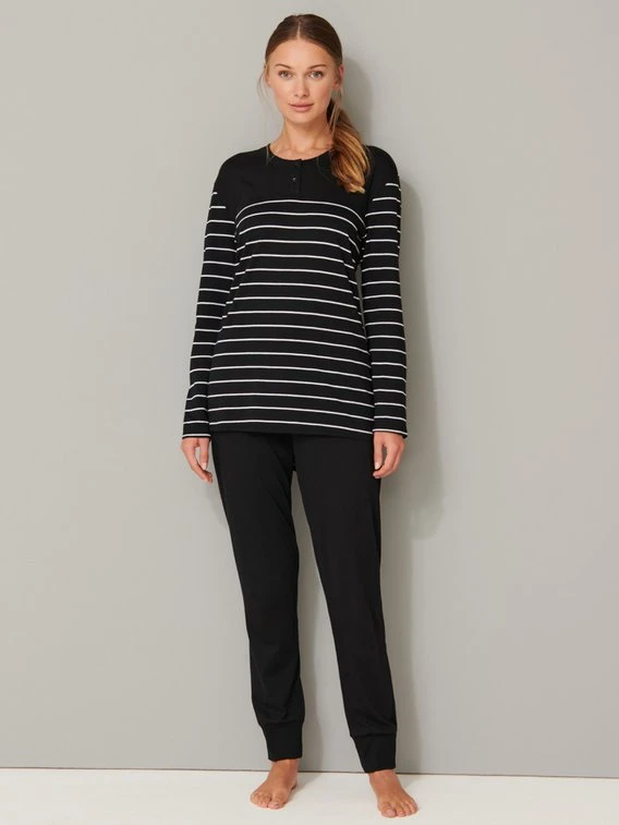 Die Materialmischung aus Baumwolle und Modal erfüllt bei diesem Bündchenpyjama von SCHIESSER aus der Reihe “Night” höchste Komfortansprüche. Die feinen Streifen im Oberteil frischen den klassischen Look auf. Begleitet wird das langärmlige Shirt mit einer unifarbenen Bündchenhose.