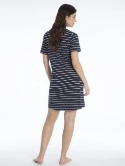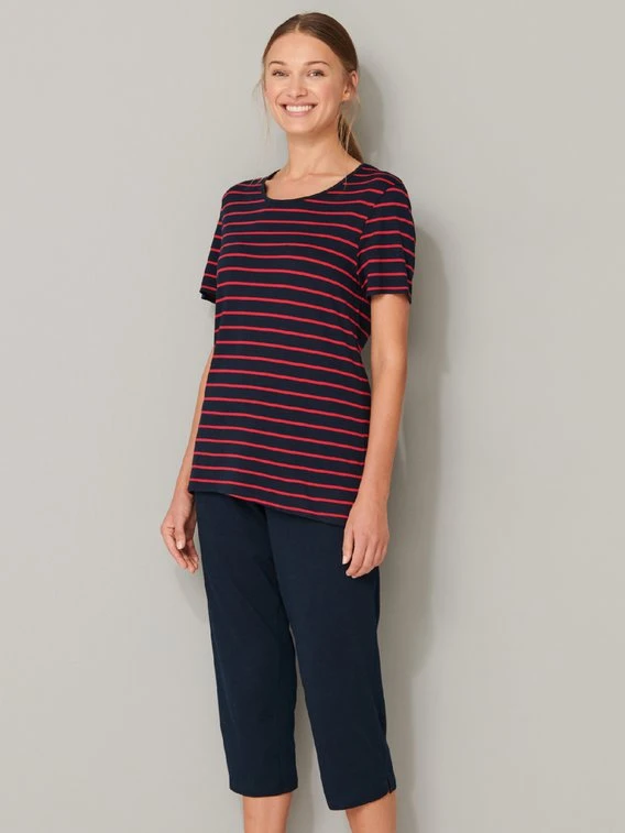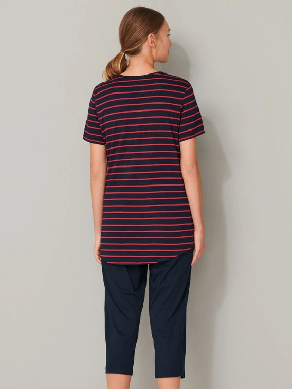 Höchster Komfort kombiniert mit zeitlosem Design, so präsentiert SCHIESSER den Pyjama aus der „Basic Night“ Serie. Der Capri-Pyjama überzeugt nicht nur durch sein angenehmes Single Jersey Material, sondern auch durch seine zeitlose Kombination aus gestreiftem Oberteil und einfarbiger Hose. Ein optisches Highlight setzt außerdem der Kordelzug, der nicht nur eine ideale Passform gewährleistet, sondern auch farblich perfekt abgestimmt ist. Dank der kurzen Ärmel des Shirts und der ¾-Länge der Hose eignet sich der Pyjama sowohl bei warmem als auch bei kühlerem Wetter.