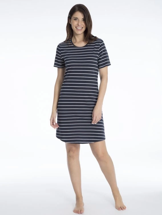 Das SCHIESSER Nachthemd aus der Serie „Basic Night“ schafft ideale Voraussetzungen für entspannte Nächte und süße Träume. Das glatte Single Jersey-Gewebe aus weichem Baumwoll-Modal-Mix liegt angenehm auf der Haut und ermöglicht nicht zuletzt wegen des abgerundeten Saumes höchsten Komfort in jeder Schlafposition. Die Ringeloptik auf dunklem Hintergrund und der farblich abgesetzte Rundhalsausschnitt runden den Look perfekt ab und machen das zeitlose Nachtkleid zum absoluten Wohlfühlprodukt.