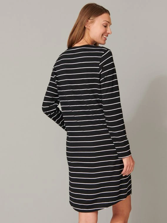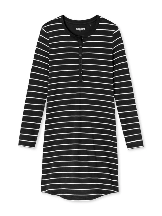 Das SCHIESSER Nachthemd aus der Serie „Basic Night“ schafft ideale Voraussetzungen für entspannte Nächte und süße Träume. Das glatte Single Jersey-Gewebe aus weichem Baumwoll-Modal-Mix liegt angenehm auf der Haut und ermöglicht nicht zuletzt wegen des abgerundeten Saumes höchsten Komfort in jeder Schlafposition. Die Ringeloptik auf dunklem Hintergrund und der farblich abgesetzte Rundhalsausschnitt runden den Look perfekt ab und machen das zeitlose Langarm-Nachtkleid zum absoluten Wohlfühlprodukt.