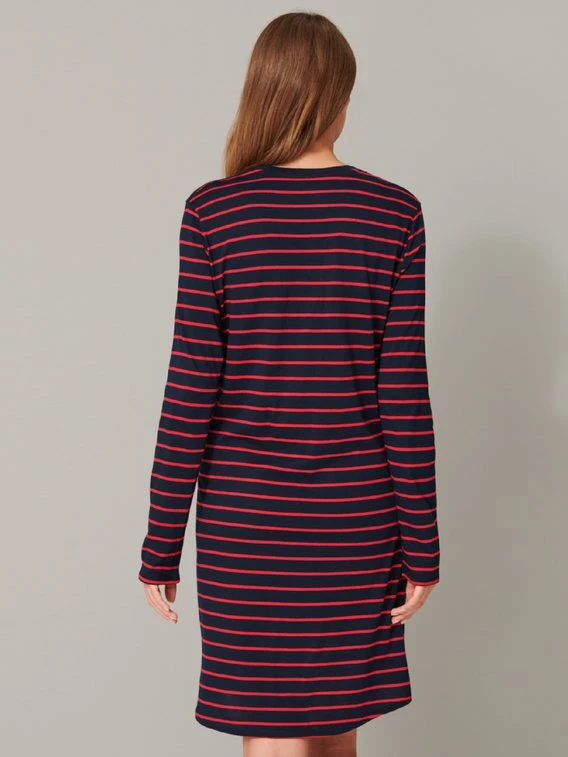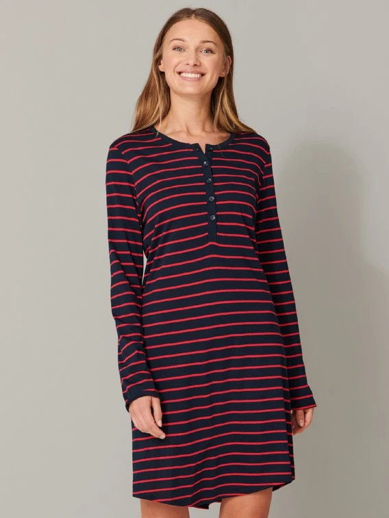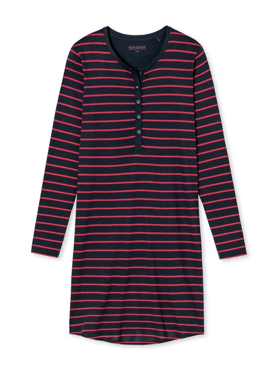 Das SCHIESSER Nachthemd aus der Serie „Basic Night“ schafft ideale Voraussetzungen für entspannte Nächte und süße Träume. Das glatte Single Jersey-Gewebe aus weichem Baumwoll-Modal-Mix liegt angenehm auf der Haut und ermöglicht nicht zuletzt wegen des abgerundeten Saumes höchsten Komfort in jeder Schlafposition. Die Ringeloptik auf dunklem Hintergrund und der farblich abgesetzte Rundhalsausschnitt runden den Look perfekt ab und machen das zeitlose Langarm-Nachtkleid zum absoluten Wohlfühlprodukt.
