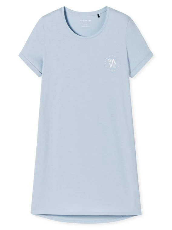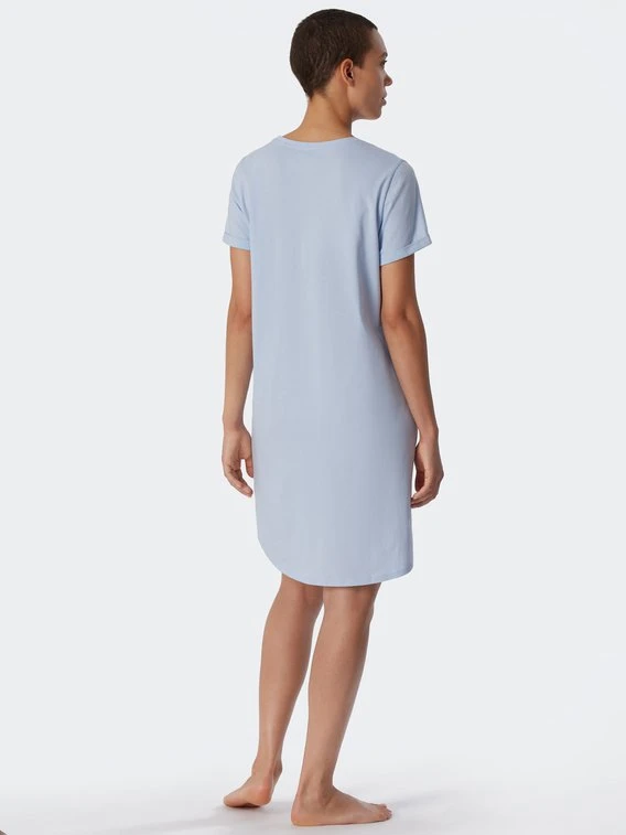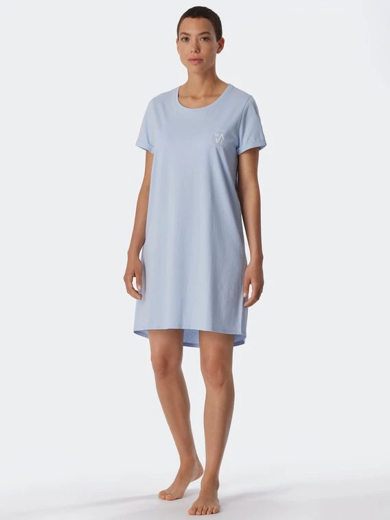 SCHIESSER präsentiert aus der “Essential Nightwear”-Serie ein klassisches Sleepshirt. Die Kombination aus reiner Bio-Baumwolle in Single Jersey-Qualität und lockerer Passform sorgt für einen angenehmen Schlaf mit genügend Beinfreiheit. Das kurzärmlige Design mit klassischem Rundhalsausschnitt wird durch einen kleinen Statement-Print auf der Brust ergänzt. Die Gesamtlänge des Nachthemdes beträgt 85cm.