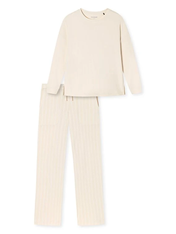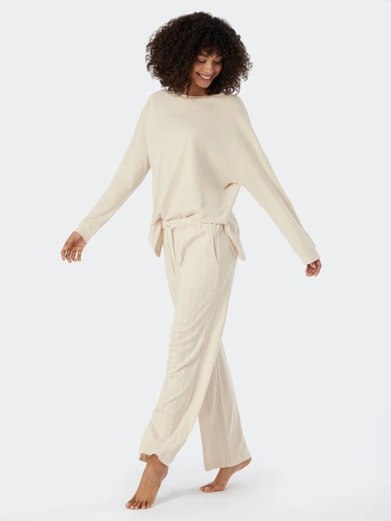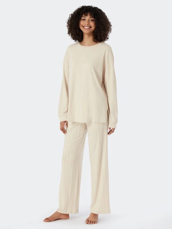 In dem langen Pyjama von SCHIESSER aus der Kollektion “Modern Nightwear” macht man eine richtig gute Figur! Softe Interlock Qualität mit Baumwolle und natürlichem, atmungsaktivem Modal liegt wunderbar weich auf der Haut. Das Langarm-Shirt begeistert mit seiner lässigen Oversized-Form, den überschnittenen Schultern mit Fledermausärmeln und den seitlichen Schlitzen. Die gestreifte Hose hat einen cleanen Marlene-Schnitt mit aufgesetzten Taschen. Für Komfort sorgt der elastische Bund mit Bindeband.