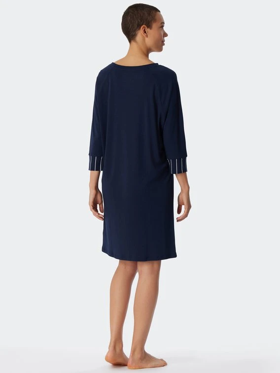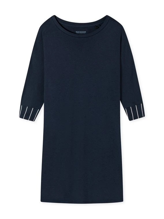 Das Sleepshirt mit 3/4-Arm von SCHIESSER aus der Serie “Modern Nightwear” verbindet Style mit Komfort. Die Interlock-Qualität mit Baumwolle und natürlichem, atmungsaktivem Modal schmeichelt der Haut mit seinem weichen Griff. Die Oversized-Silhouette mit überschnittenen Schultern und Fledermausärmeln ist modern und bequem zugleich. Das Design wird durch die breiten, gestreiften Bündchen an den Ärmeln abgerundet.