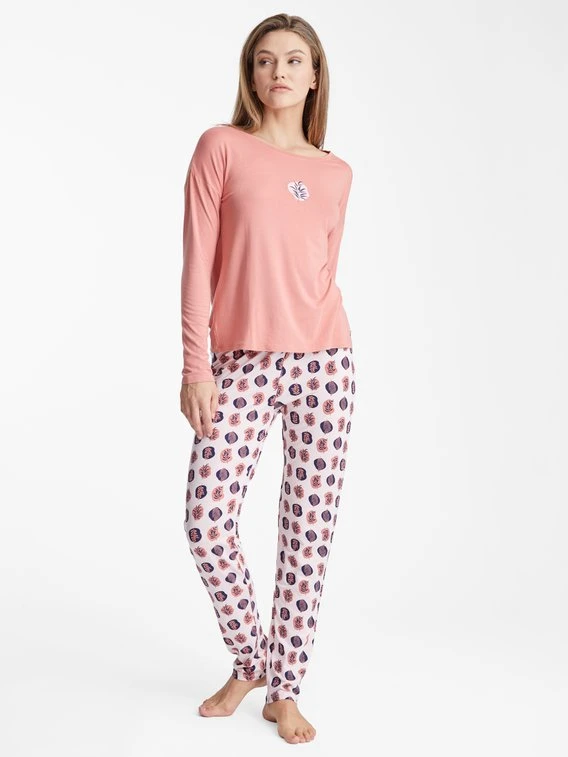 Im herbstlichen, gemütlichen TOM TAILOR Look zeigt sich dieser Pyjama aus der „Nightwear“-Kollektion. Das Oberteil mit langen Ärmeln ist unifarben gehalten, mit einem kleinen Brustprint passend zur Hose und figurumspielend geschnitten. Dazu passt hervorragend die gemusterte Hose. Der gesamte Pyjama besteht aus einem hohen Anteil an hochwertiger Viskose, die ein leichtes Tragegefühl fördert.
