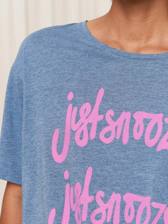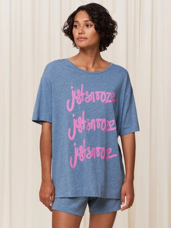 TRIUMPH präsentiert ein lässiges Kurz-Pyjama Set. Das Oversized-Shirt mit überschnittenen Schultern und lässigem “just snooze”-Schriftzug bietet viel Freiheit beim Schlafen und liegt dank weichem Bio-Baumwoll-Modal-Mix sanft auf der Haut. Ergänzt durch eine kurze Pants wird es zum neuen Lieblings-Sommer-Pyjama.