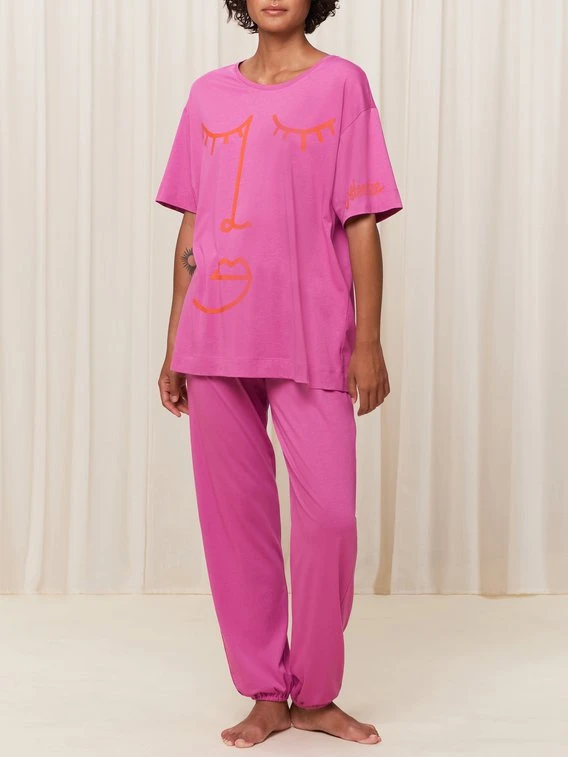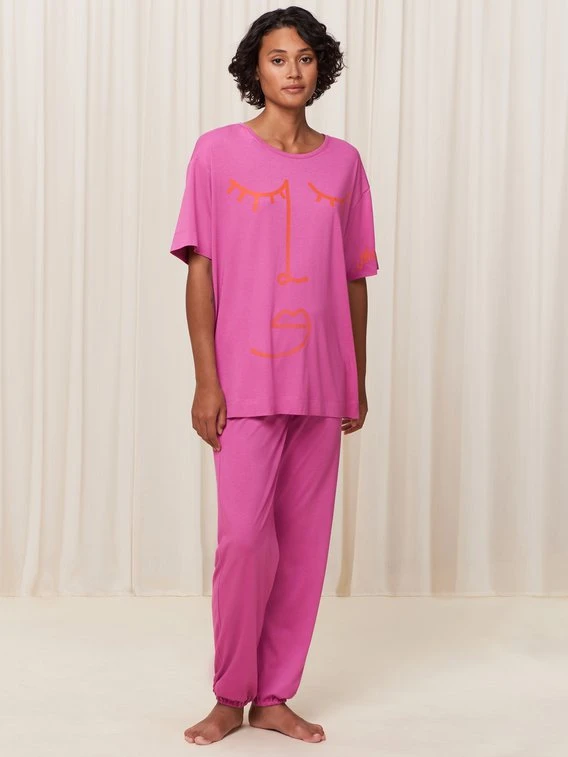 Zum Träumen gedacht ist dieses Pyjama-Set von TRIUMPH. Für erholsamen Schlaf sorgt der hautfreundliche Material-Mix aus Bio-Baumwolle und TENCEL™ Modal. Das T-Shirt im Oversized-Schnitt mit Rundhalsausschnitt und überschnittenen Schultern ziert ein abstrakter Gesichtsausdruck-Print. Die bequeme Hose mit elastischen Bündchen sorgen für Halt ohne zu verrutschen. Dieser Pyjama ist der perfekte Begleiter an lauen Sommerabenden.